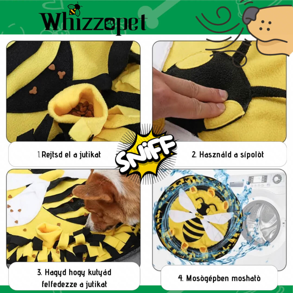 A Méhecskés Szimat Szőnyeg speciálisan kialakított zsebei és rétegei rengeteg elrejtett helyet kínálnak a jutalomfalatok számára, melyek felkutatása hosszú ideig leköti kedvenced figyelmét. Ez a szellemi stimuláció nemcsak szórakoztató, de elengedhetetlen a kutyák mentális egészségének fenntartásához. Az interaktív keresgélés fejleszti a problémamegoldó képességet és elősegíti a nyugodt viselkedést.