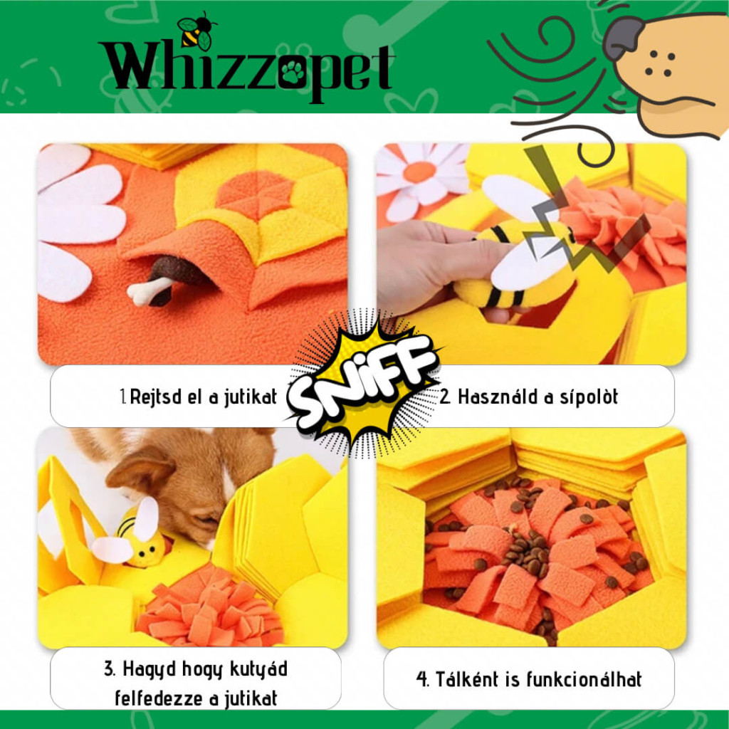 Ez a szőnyeg nem csupán egy játék, hanem egy komplex fejlesztő eszköz, amely hozzájárul kutyád mentális és fizikai jólétéhez. A látványos dizájn, a sípoló méhecskék és a kihajtható hatszögek egyedülálló játékélményt nyújtanak, amely hosszú távon is leköti és fejleszti kedvencedet.